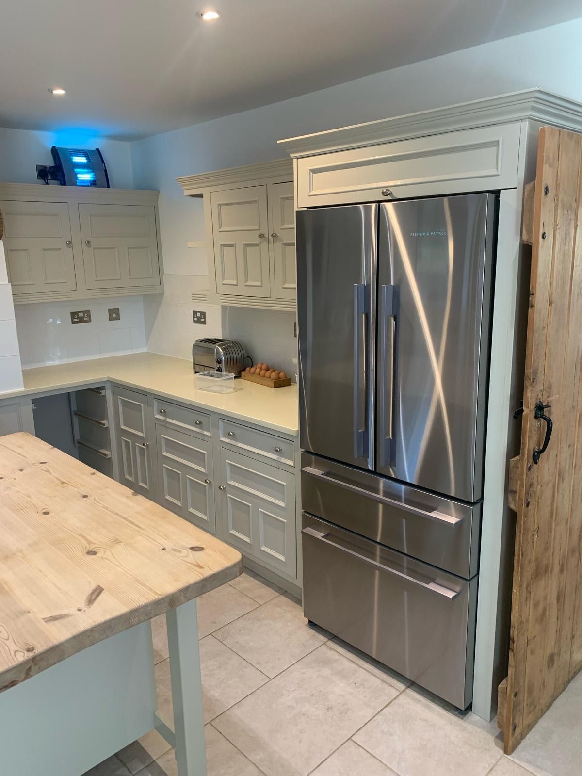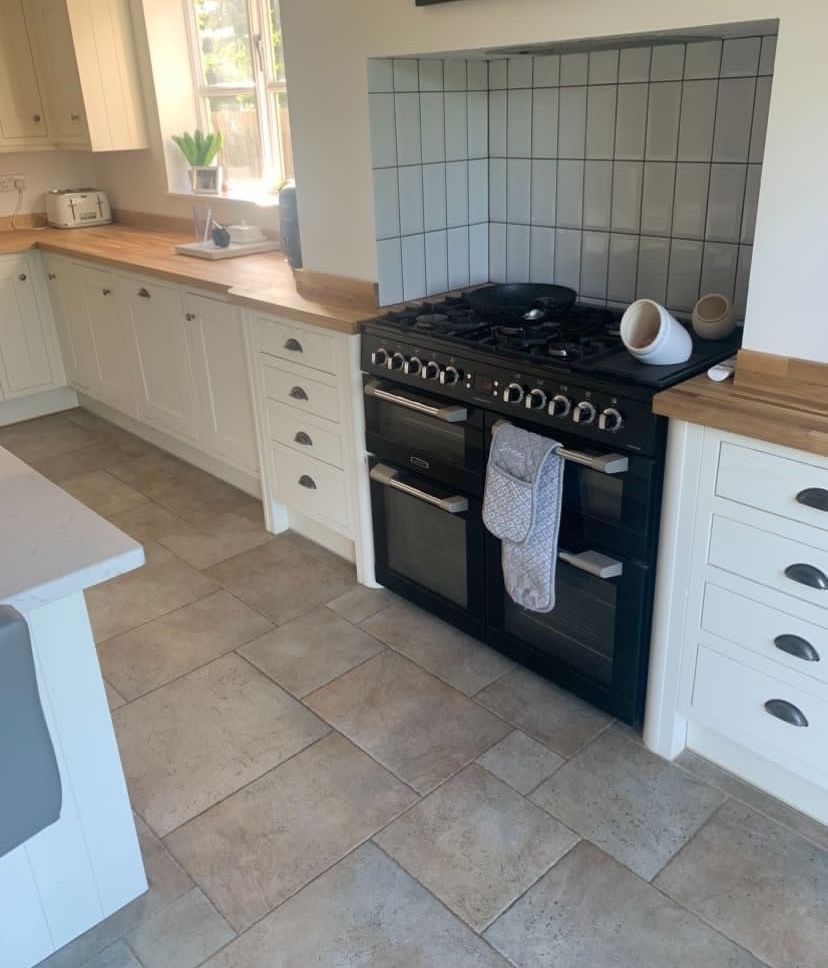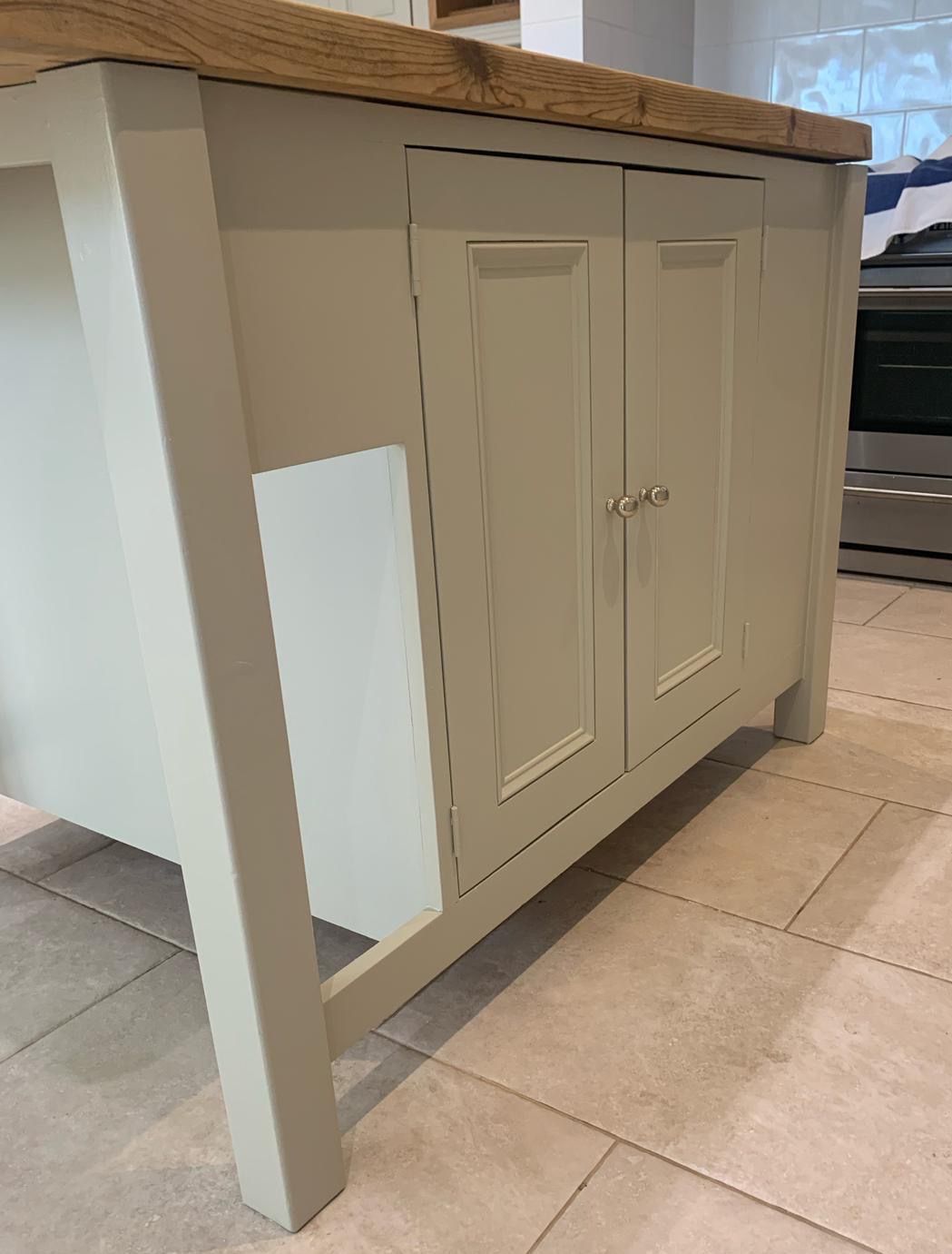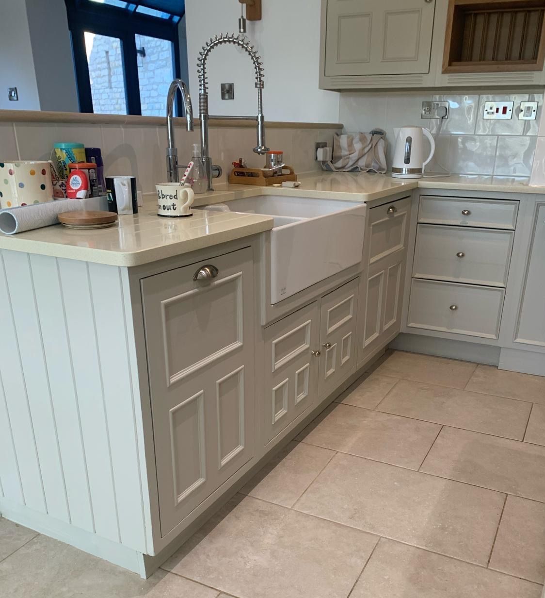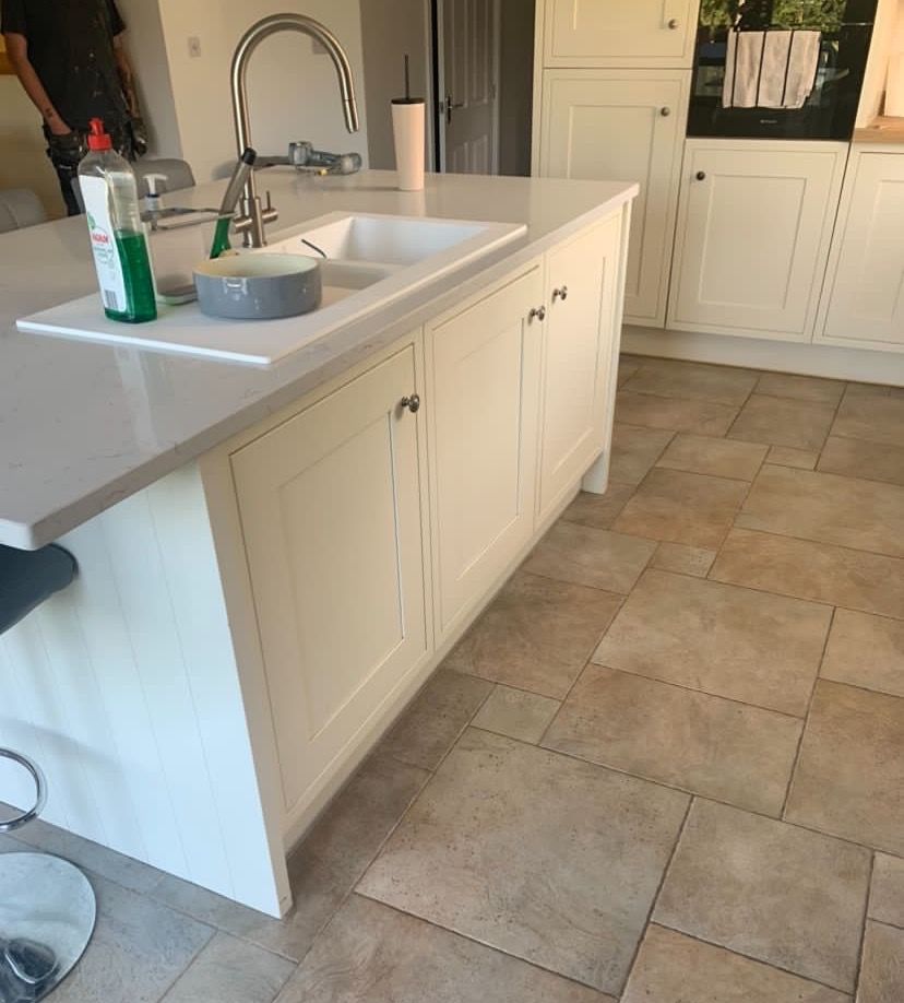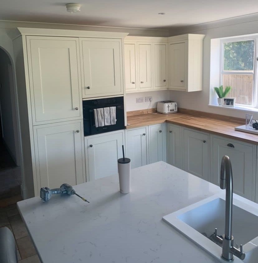 The recent kitchen renovation at a property in Empingham, Rutland, resulted in the transformation of an existing kitchen painted in Farrow and Ball's Little Portland Greene, with the exception of the island, which was painted in Farrow and Ball Old White, giving it a fresh and crisp new look.