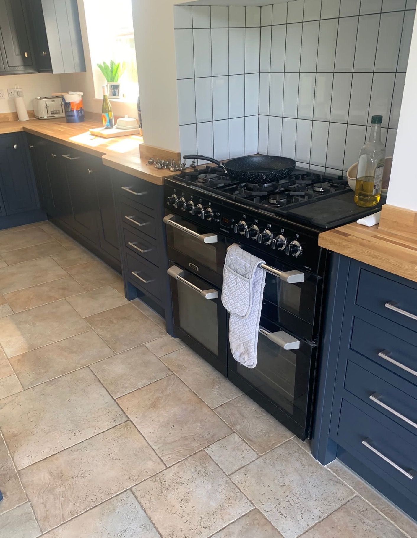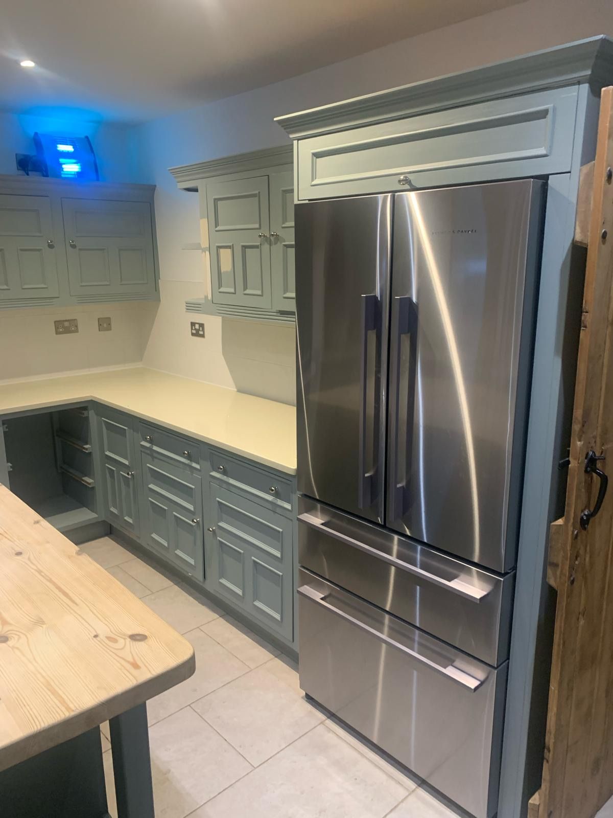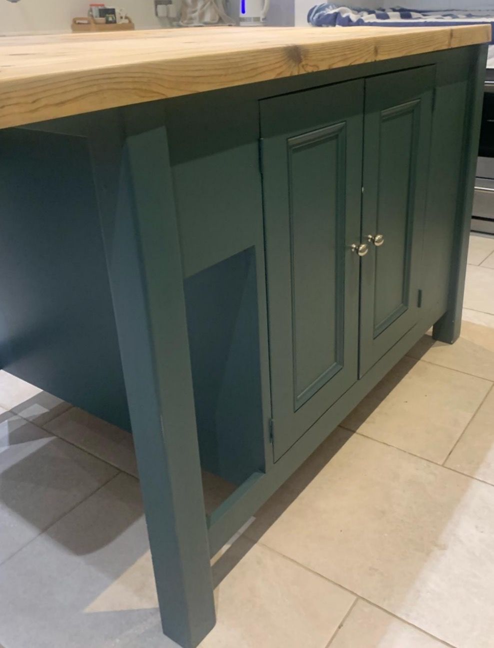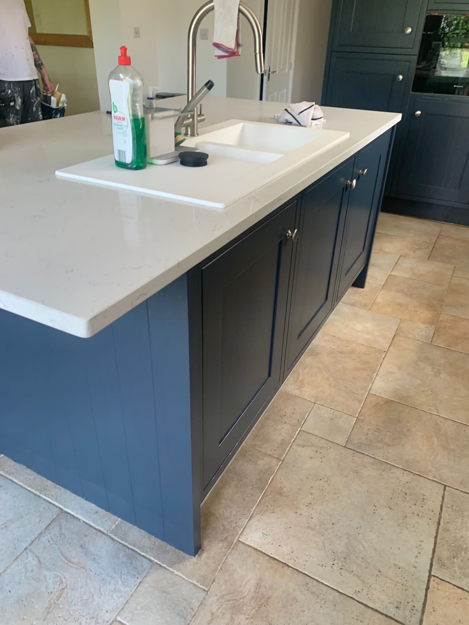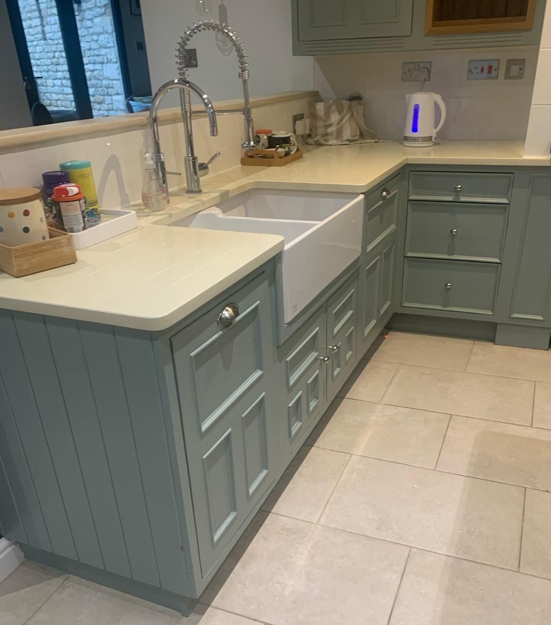 The recent kitchen renovation at a property in Empingham, Rutland, resulted in the transformation of an existing kitchen painted in Farrow and Ball's Little Portland Greene, with the exception of the island, which was painted in Farrow and Ball Old White, giving it a fresh and crisp new look.
